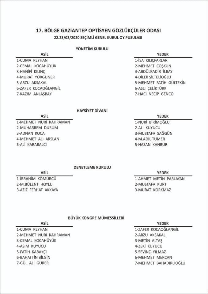 Optik Gazete olarak Genel kurulda ilk Gaziantep Optisyen Gözlükçüler Odası başkanı olarak seçilen Cuma Reyhan ve ekibini kutluyor, başarılar diliyoruz, Gaziantep Optisyen - Gözlükçüler odasına bağlı Kahramanmaraş, Malatya, Adıyaman ve Kilis illerimizdeki tüm sektör mensuplarına hayırlı olmasını diliyoruz