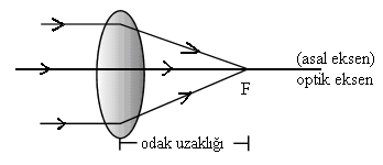 Şekil 1 Paralel gelen ışınların konveks lenste kırılarak bir odak noktasında kesişmesi.