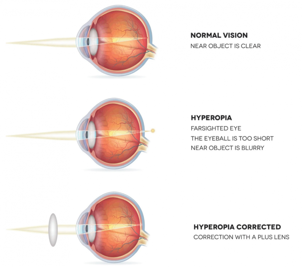 Hipermetrop göz kusuru ise mercekte kırılan ışıkların retinanın arka kısmına düşmesi ile oluşan bir göz kusurudur. Gözün arka veya ön boyunun yani göz küresinin olması gerekenden daha kısa durumda olması sonucu hipermetrop göz kusuru görülür. Çünkü gözün arka ve ön boyunun kısa olması, korneanın yeterli kavisi oluşturamamasına ve görüntünün bozulmasına neden olmaktadır.
