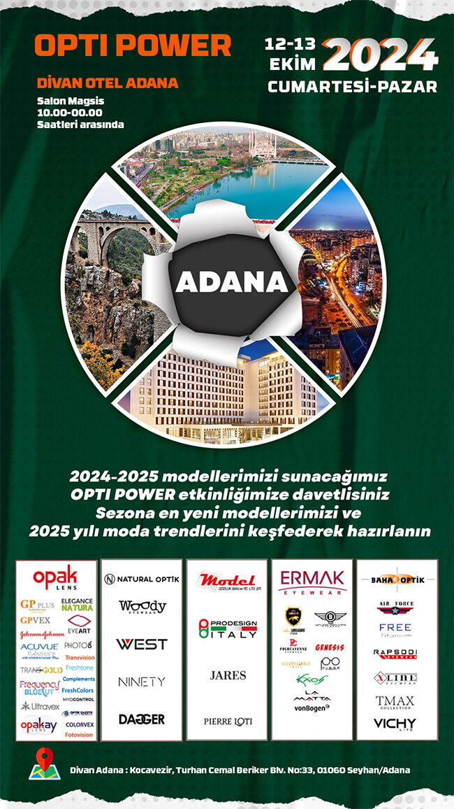 Ülkemizin önde gelen yerli ve milli sermayeli oftalmik cam ve gözlük çerçevesi üretimi yapan 5 Büyük firmasının düzenlediği OPTI POWER etkinliğinin 2. toplantısı ADANA ilimizde gerçekleştirilecek.
